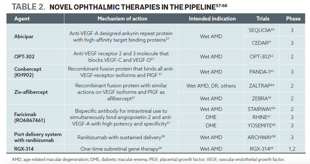 Further innovations in treatment for eye disease are expected in the future. Understanding genetic components to therapy response will help individualize treatments for better results. Single nucleotide polymorphisms in genes may influence treatment response in wet AMD. Meanwhile, clinical trials are ongoing for current anti-VEGFs. CAN-TREAT is reviewing ranibizumab dosage and extended frequency for wet AMD. LUMINOUS is a 5-year outcomes-related trial of ranibizumab for wet AMD and other eye diseases. RIVAL compares aflibercept and ranibizumab with a treat-and-extend regimen for AMD. Several other new therapies for eye diseases are also in the pipeline.